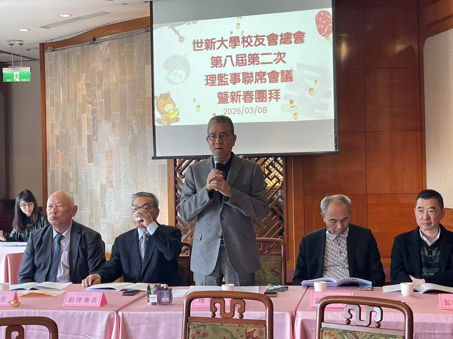 世新大學校友會總會(3/8)日在兄弟大飯店舉辦新春團拜暨理監事聯席會議,吸引眾多校友與師長出席,現場氣氛熱絡。校長陳清河率校方團隊與會,包括副校長賴正能、主任秘書呂慧芳,以及多位學院院長與行政主管同席交流;前校長吳永乾與夫人及董事黃東烈亦到場共襄盛舉。