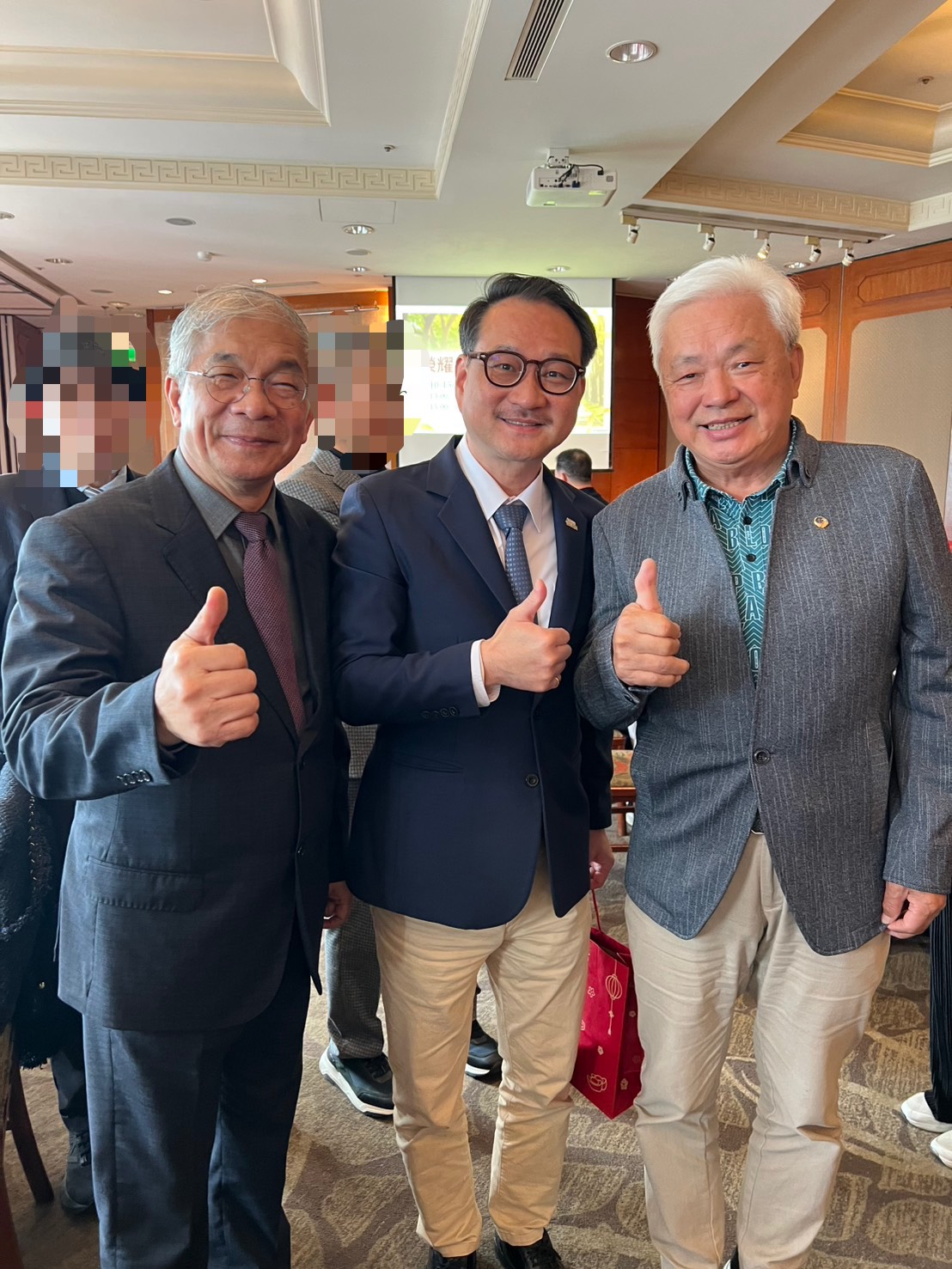 圖三:世新大學校長陳清河(左)、阮昭雄副秘書長(中)、金門校友會陳滄江顧問(右)與校友們分享70週年校慶活動。